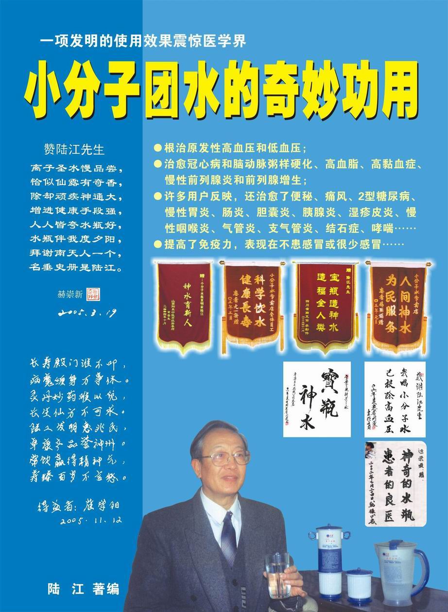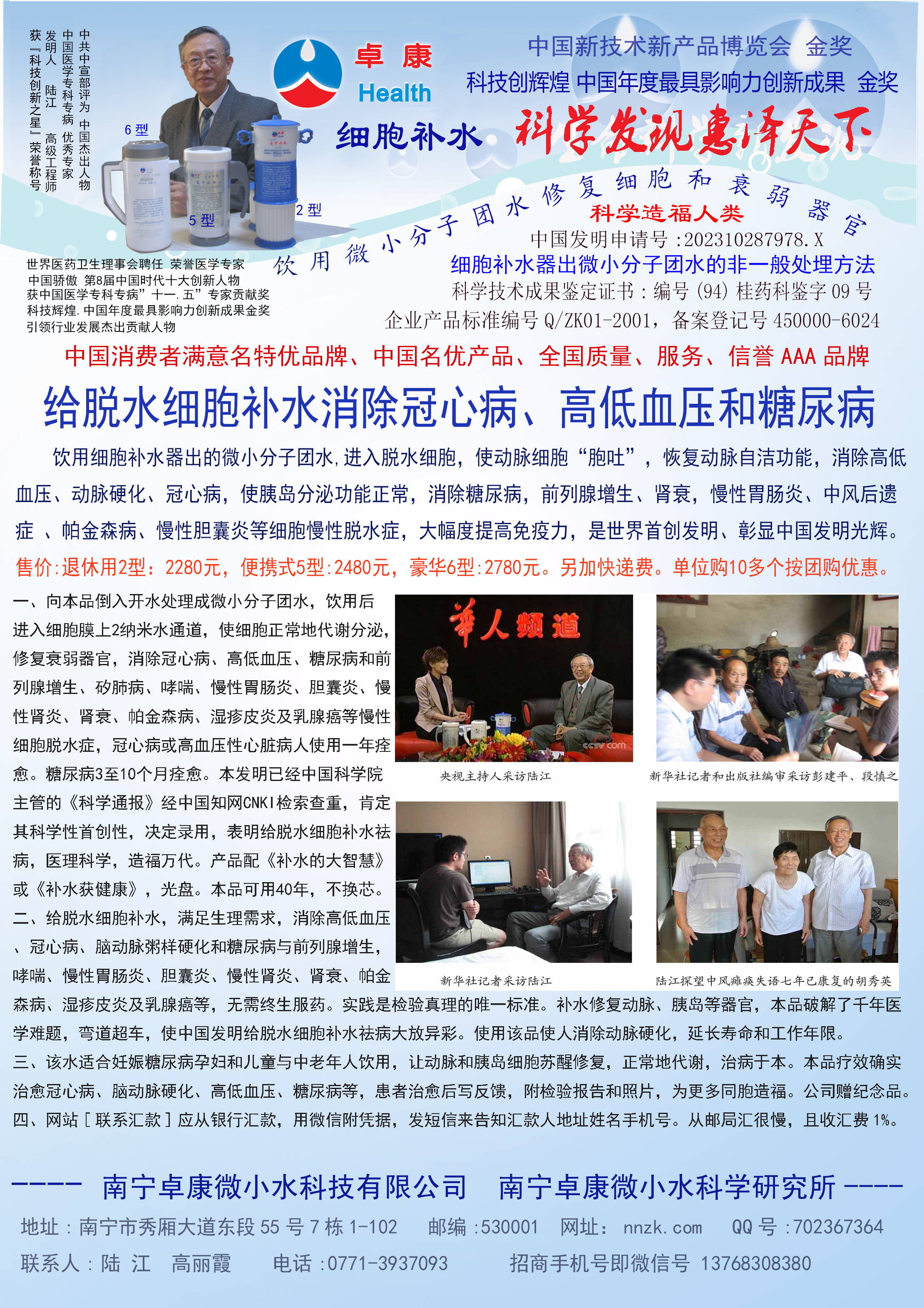 人類幾千年來患以上病癥需終生服藥,幾十年也不能治愈。可是我國南寧的高級工程師陸 江,于1990年想根治高血壓,研究發(fā)明了離子水瓶,處理出微小分子團水供飲用,經過醫(yī)院臨床試用和專家鑒定,1999年獲中國發(fā)明專利權,產品于2000年投放市場后一直跟蹤調查,據全國各地用戶反饋:祛除了高低血壓、糖尿病和冠心病,并使前列腺增生、咽喉炎、鼻竇炎、慢性氣管炎、支氣管炎、矽肺病、哮喘、慢性胃炎、腸炎、慢性膽囊炎、慢性腎炎、腎衰、膀胱炎、便秘、痔瘡、風濕性關節(jié)炎和濕疹皮炎及中風后遺癥等病癥不藥而愈。為什么喝微小水能治20多種病?陸 江從1991年德國科學家發(fā)現細胞膜水通道僅為2納米獲得啟發(fā),認為多種器官患病是因細胞脫水,不能正常代謝和分裂增殖,才使器官細胞減少致衰弱萎縮而形成細胞缺水性病癥。22年來的實踐有力地支持了“細胞脫水致病”這一重要論點,表明喝微小水可滿足細胞的生理需求,補水就能祛病,是生命科學新亮點。